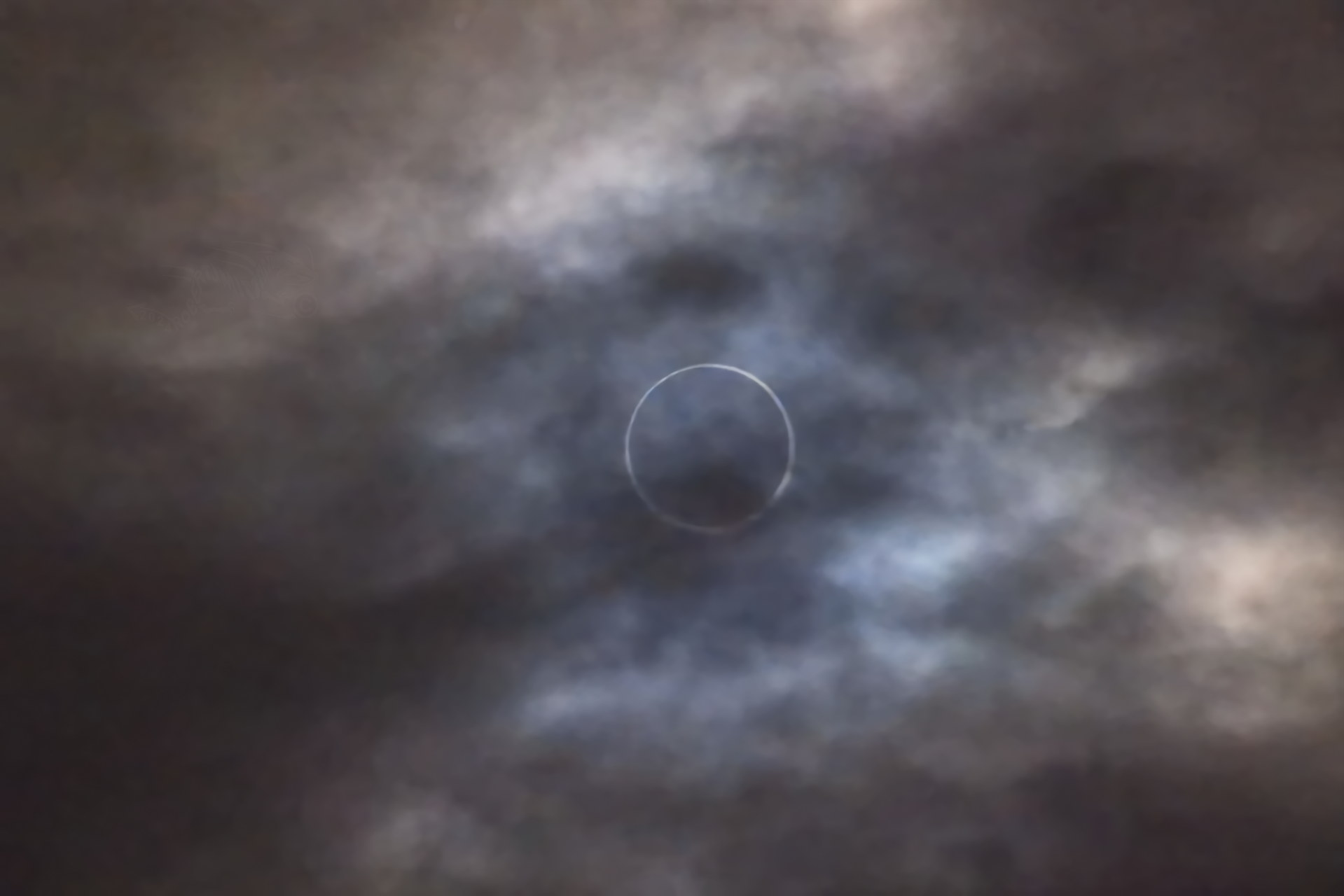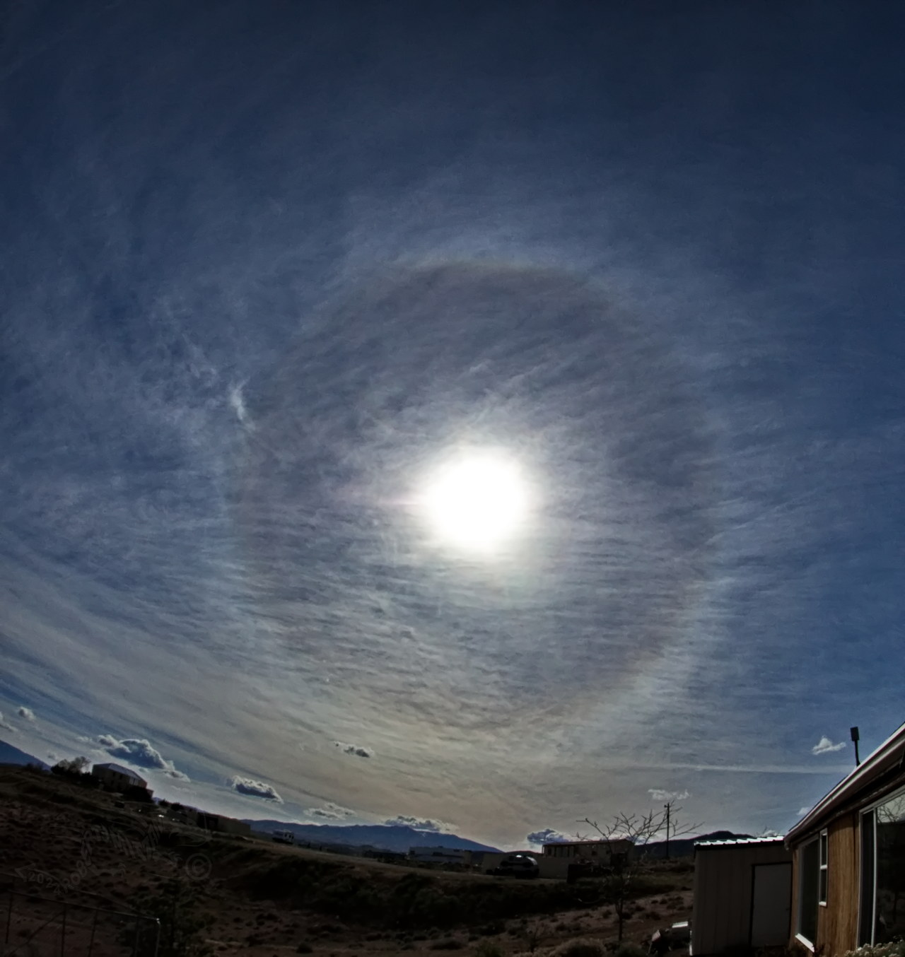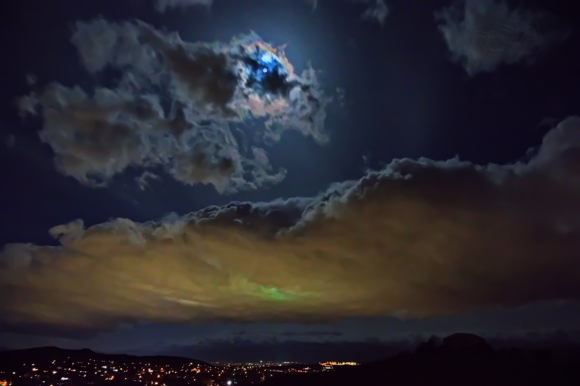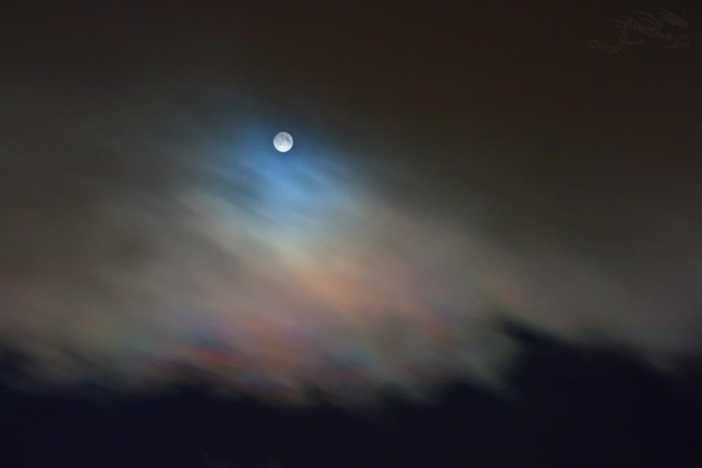 PICTURE: The moon peering through high cirrus clouds. Thin high clouds can diffract light into this colorful lunar iris.