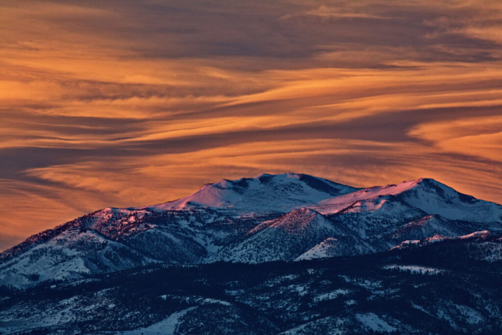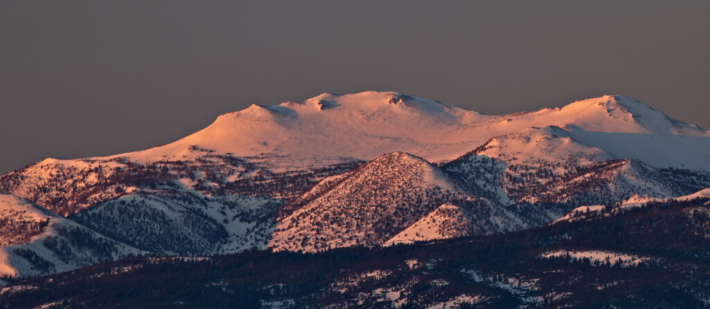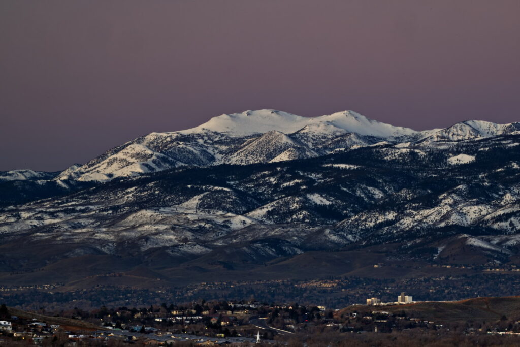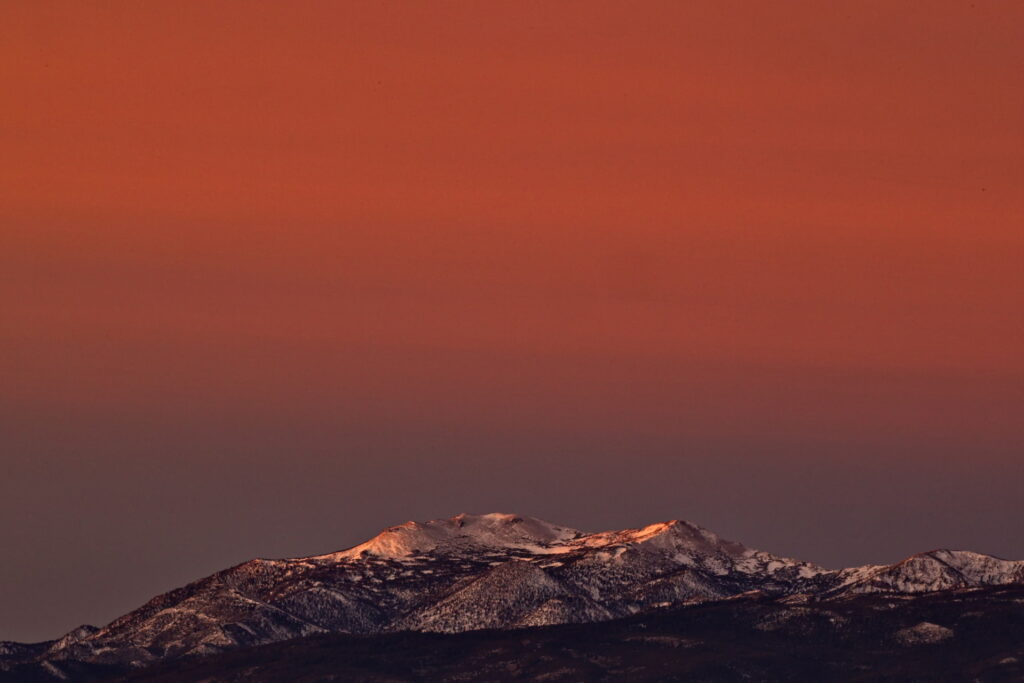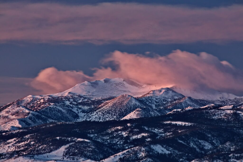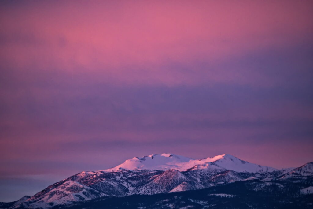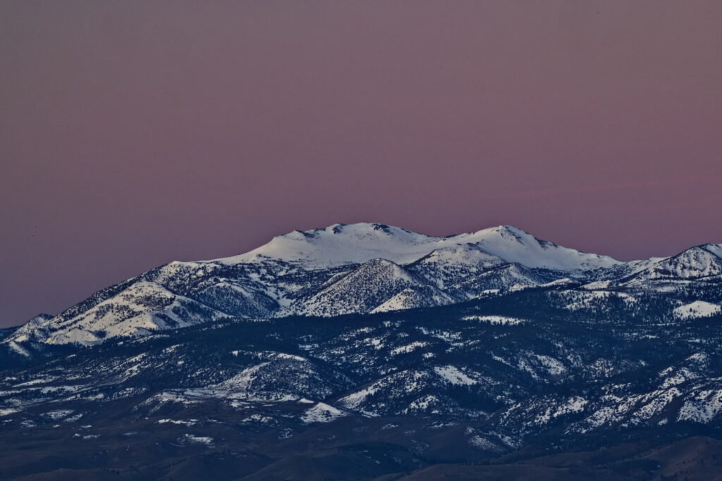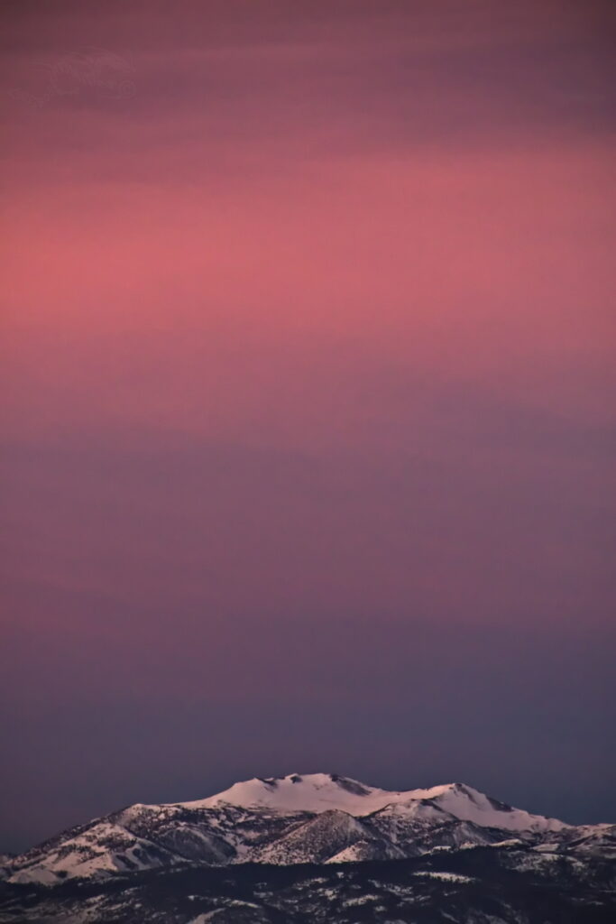 Above: Rose’s face (summit of Mt. Rose) against a purple to lilac sky. Such dawn color pops only when the air is exceptionally clear. It lasts maybe two minutes.