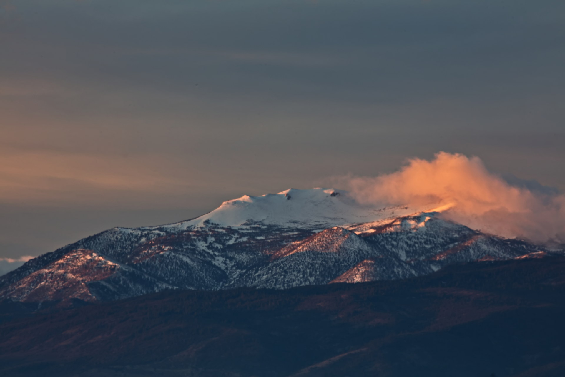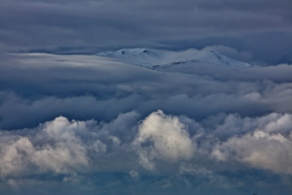 PICTURE: Mt. Rose summit’s astounding resemblance to a human face. In this picture, Rose’s face is framed in flowing ‘cloud hair’, lit by early dawn coral beams.